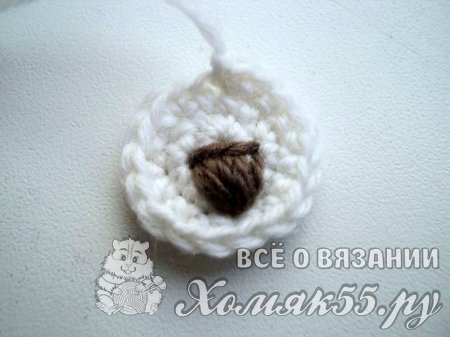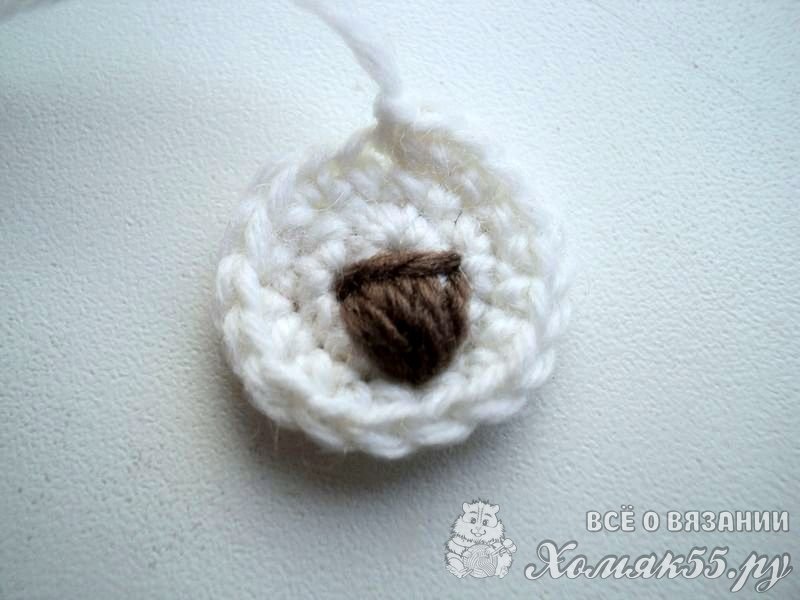 Белой пряжей сделаем мордочку медвежонку. Вяжем круг. В петельку провязываем шесть СБН. В новом ряду вяжем по два СБН во все петелечки. И в следующем ряду вяжем СБН, а во вторую петлю два СБН. Так весь ряд. Вышиваем на мордочке носик.