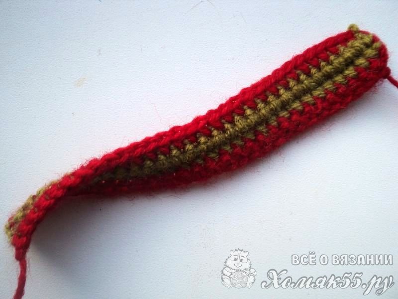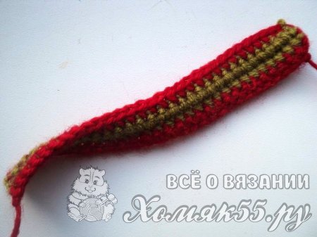 Выполняем красной тридцать петелек. И вяжем один ряд СБН. Затем меняем нитку на зеленую или оливковую и вяжем два ряда. И еще раз сменим нить на крусную и провяжем ряд.