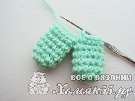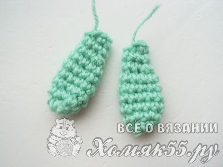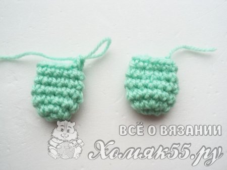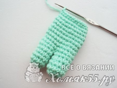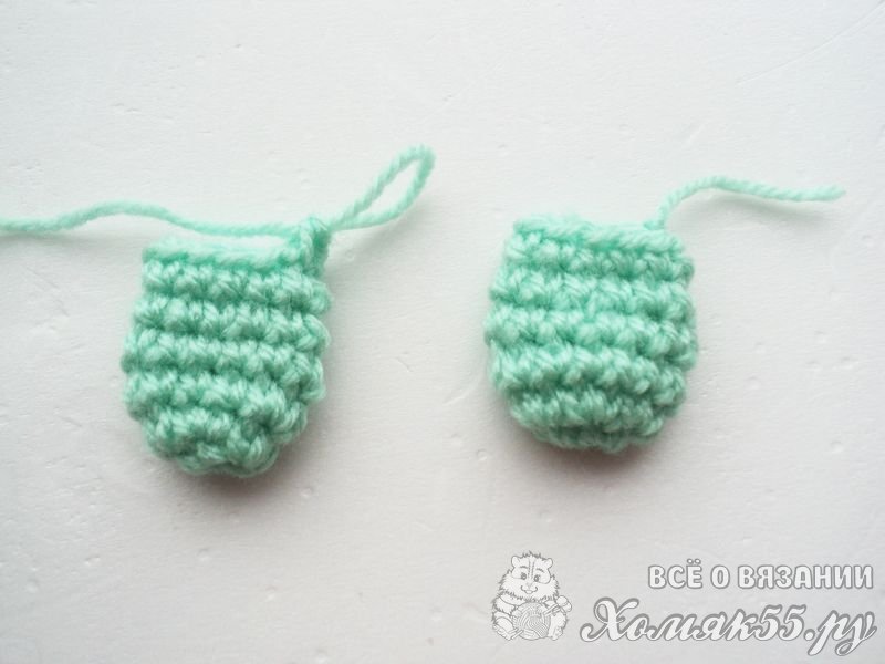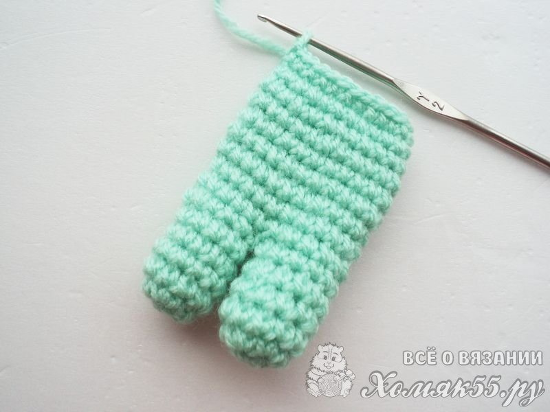 Для этого нужно так же сформировать начальное кольцо, но уже из 6 петель. Как и при вязании ручек, провязываем далее по 2 СБН в каждую петлю. То есть увеличиваем их количество в 2 раза. Теперь нам нужно провязать 4 ряда по 12 СБН. На этом этапе будем наполнять ножки синтепоном.