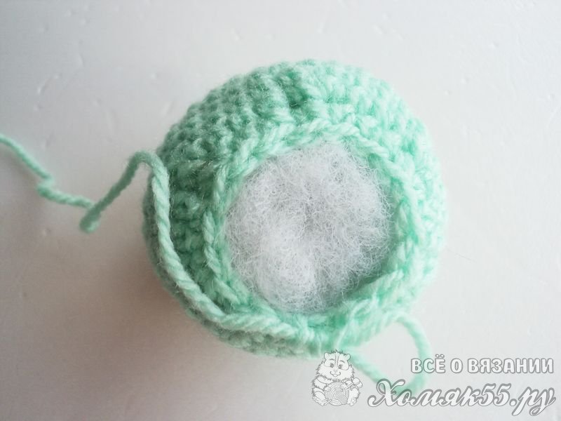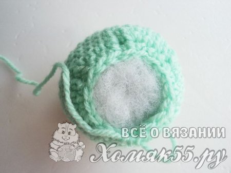 Теперь будем делать убавки в каждом ряду. Сначала убавляем через каждые 4 петли, в новом ряду через 3, далее через 2 петли. У нас остается 24 петли. Наполняем деталь синтепоном. У нас получился шарик.
