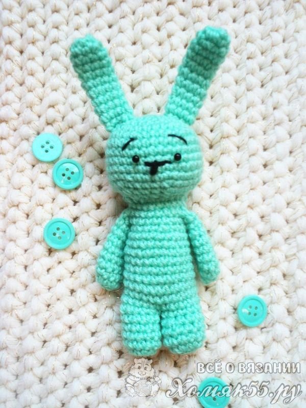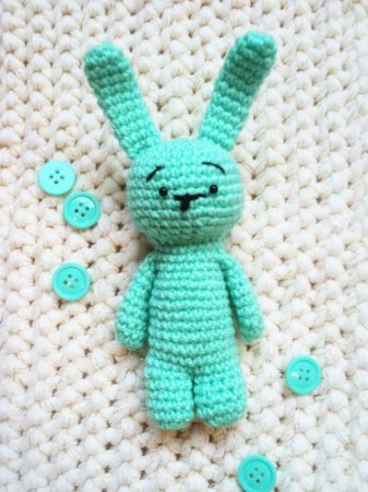 Игрушки, вязанные методом амигуруми, получаются очень забавными и милыми! Этот метод так же хорош и тем, что он не требует специальных знаний и умений. Достаточно знать элементарные обозначения, чтобы связать милого зверька. В этом мастер-классе мы будем вязать забавного зайку мятного цвета.
