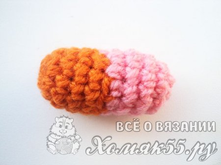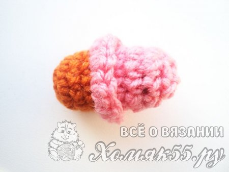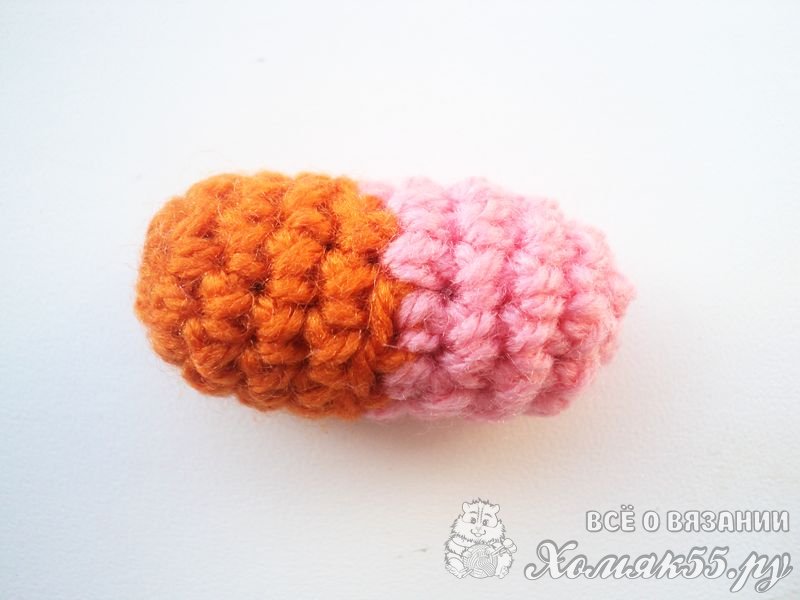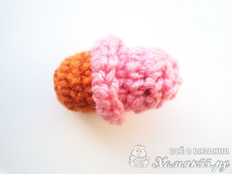 Затем сменим пряжу на розовую и свяжем еще 1 ряд, но теперь крючок будем заводить только за задние стенки петель. И еще провяжем 2 ряда. Затем наполним деталь синтепоном и выполним 1 ряд, убавляя через петлю. Затем убавки вяжем в каждую петлю. В итоге отверстие закроется. Делаем 1 ВП и затягиваем нить. Обрезаем ниточку.
