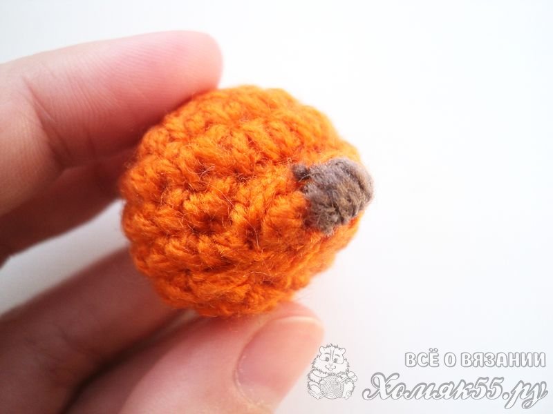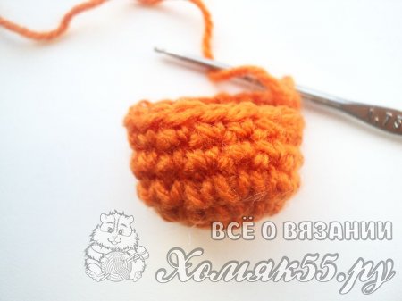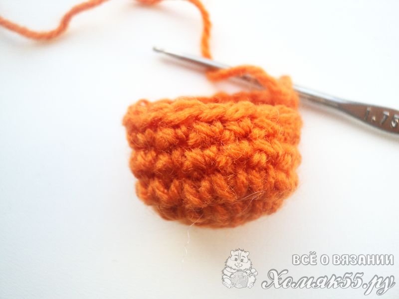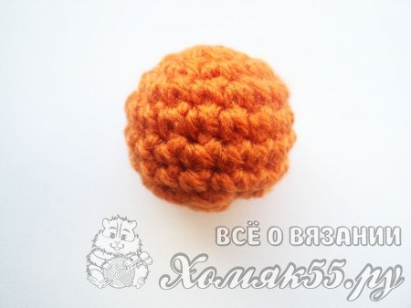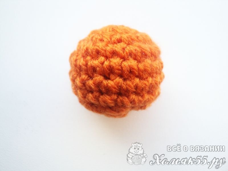 И провяжем еще 1 ряд с прибавками. Прибавлять будем в каждую 2-ю петлю ряда. Затем выполним 3 ряда по 18 СБН. Наполняем деталь синтепоном и вяжем ряд с убавками через 1 петлю. Далее убавляем в каждую петлю до закрытия детали.