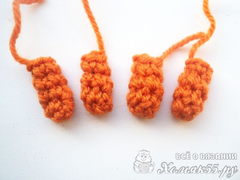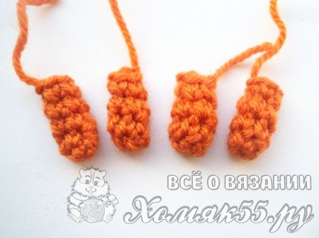 Все 4 лапы будем вязать по 1 схеме. Вяжем в скользящую петлю 5 СБН, затем выполняем 4 ряда по 5 СБН в каждом из них.