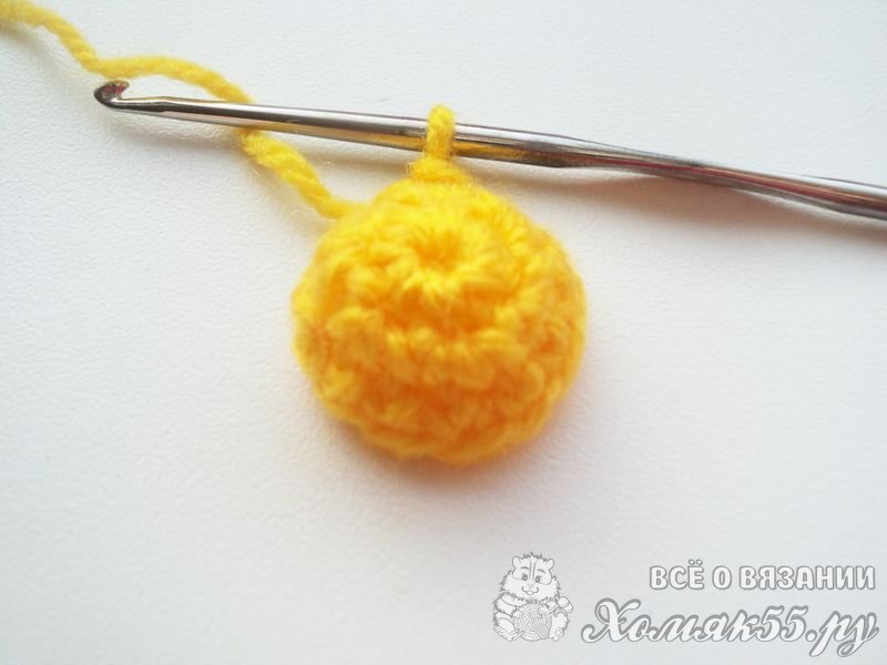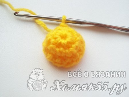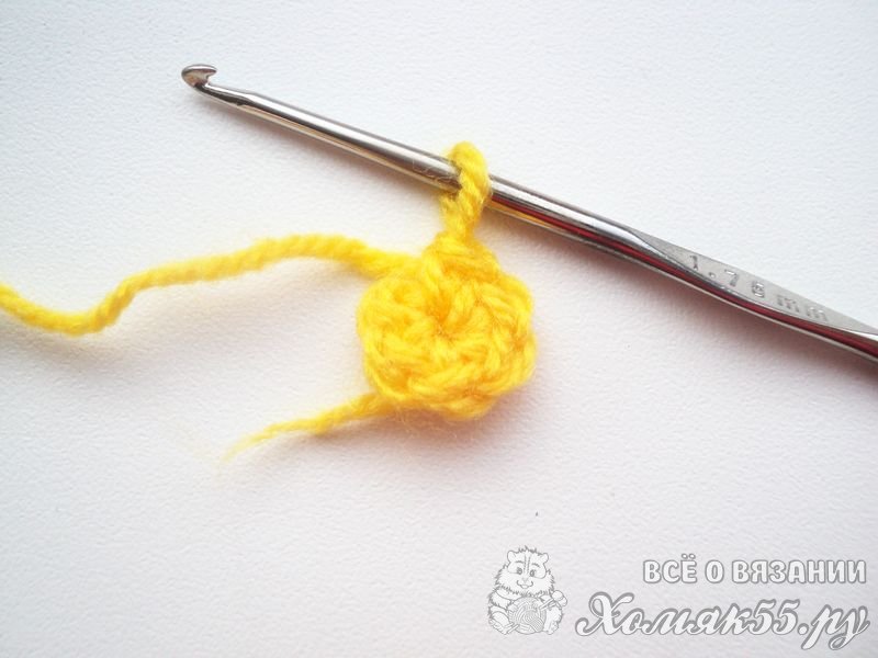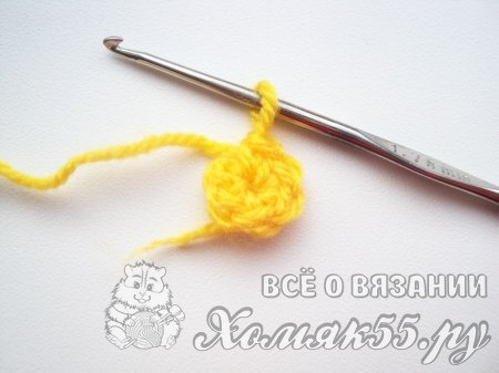Начнем с вязания желтка и возьмем пряжу желтого цвета. Выполним 2 петли и во 2-ю свяжем 6 столбиков без накида.