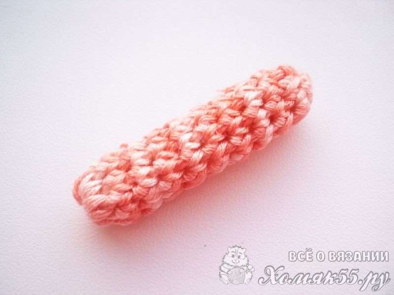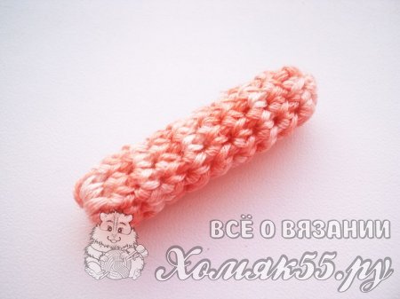 Мулине персикового цвета нам необходимо для вязания сосиски. Вяжется она очень просто и быстро. Сделаем 2 первые петельки. И провяжем во 2-ю 10 столбиков без накида.