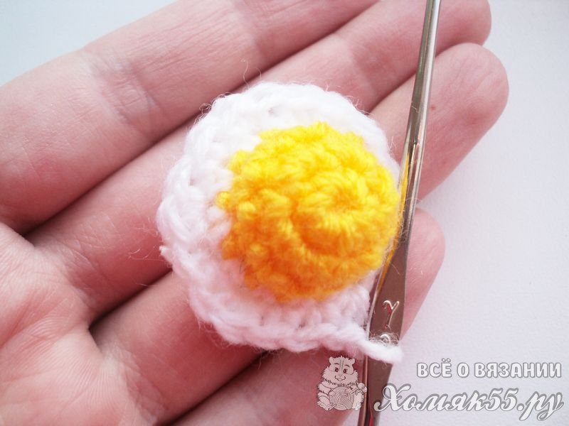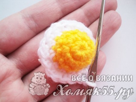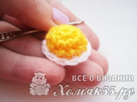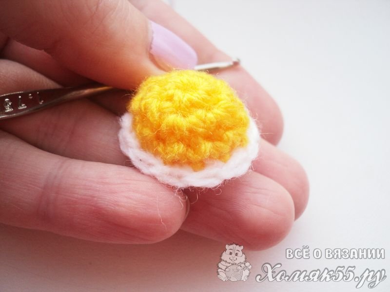 Теперь прикладываем белую часть к желтой и сшиваем столбиками без накида по кругу. При этом нужно наполнять желток синтепоном.