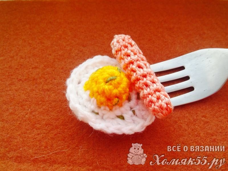 А дальше будем вязать по кругу 10 рядочков столбиками без накида. Сосиску наполним синтепоном. Затем провяжем по 2 столбика вместе. В итоге останется всего 5 петелек. Пропустим через них нитку и стянем покрепче. Спрячем ниточку внутри сосиски. Сосиску можно пришить к яичнице, а можно оставить и так.