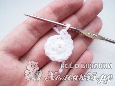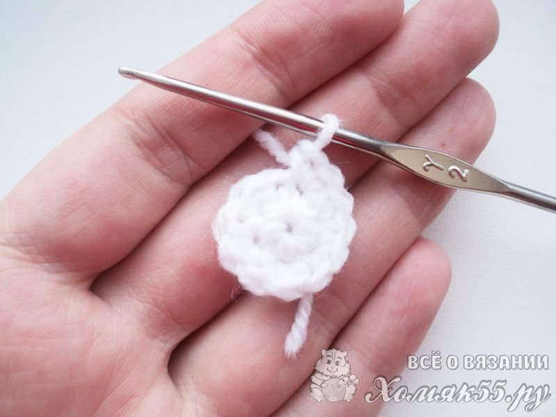 Нитку обрываем и берем пряжу белого цвета. Выполняем 2 петли и во 2-ю свяжем 6 столбиков без накида. Во 2-м ряду провяжем по 2 столбика в петлю. Итого получится 12 столбиков без накида.
