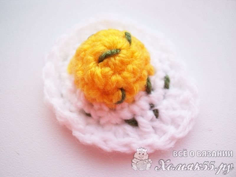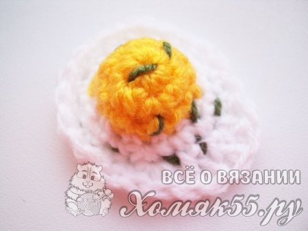 Далее вяжем в 2 петли по 1 столбику без накида. В следующую петлю выполним 2 полустолбика с накидом. В 2 следующие петли вяжем по 1 столбику с накидом. В следующую петельку выполним 2 столбика с накидом. Далее вяжем в новую петлю полустолбик с накидом. В следующую петлю выполняем столбик без накида. В следующую провяжем 2 столбика без накида. И довяжем ряд столбиками без накида. Яичница готова. Теперь можно украсить ее «зеленью».
