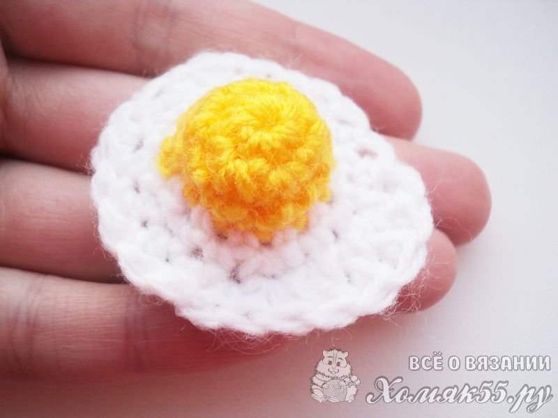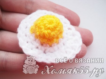 Вязаная еда отлично подойдет для развития ребенка, для его игры. А связать ее можно самостоятельно. В этом мастер-классе свяжем яичницу крючком. Вяжется она несложно, а получается очень похожей на настоящую. Яичница, вязанная крючком, подойдет для кукольного домика.