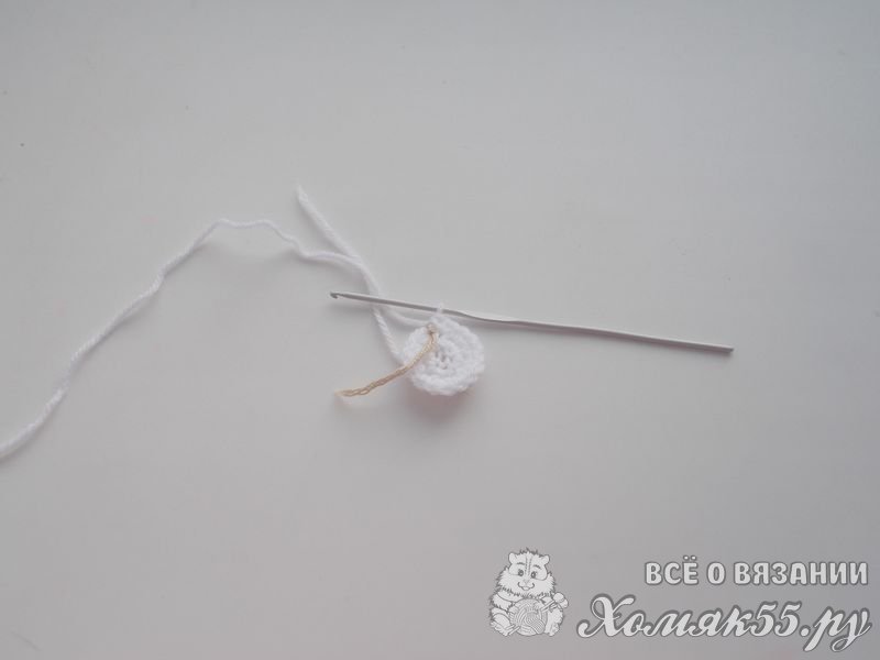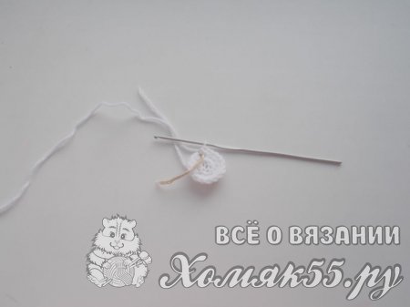 На крючок наберите цепочку из четырех воздушных петель. Замкните цепочку в кольцо и скрепите соединительной петлей. Обвяжите кольцо 8 полустолбиками без накида.
