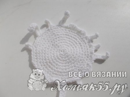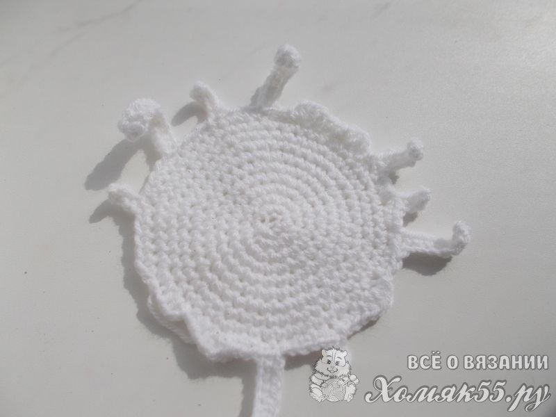 Если Вы, когда ни будь пробовали или покупали в магазине кулич, то обращали внимание, что сладкая сахарная помадка прям стекает по краям кулича. Вот нам нужно тоже самое сейчас изобразить крючком. Сделать это очень просто. Когда будете обвязывать край, наберите цепочку из 6 воздушных петель. Провяжите ее полустолбиками без накида и соедините обратно с крайним рядом.