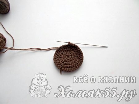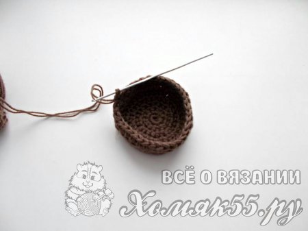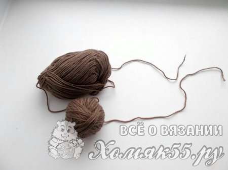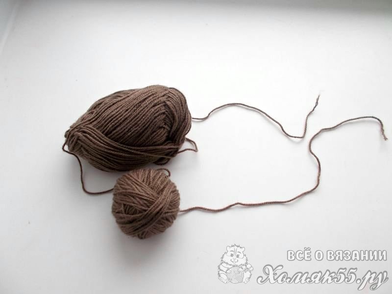 Вязание начнем с основы. Возьмите акриловую нить коричневого цвета. Размотайте клубок на два небольших клубочка. Чтобы кулич был устойчивым необходимо вязать его в две нити.