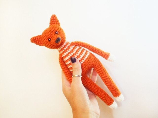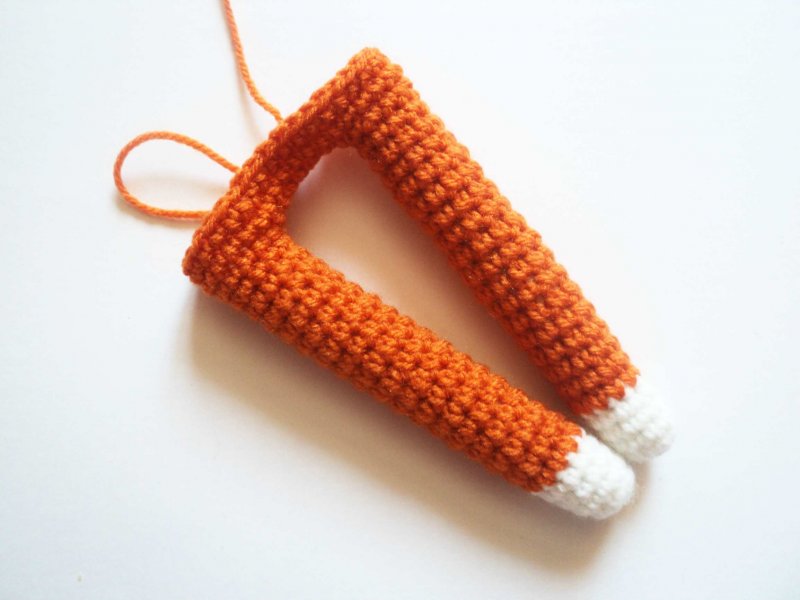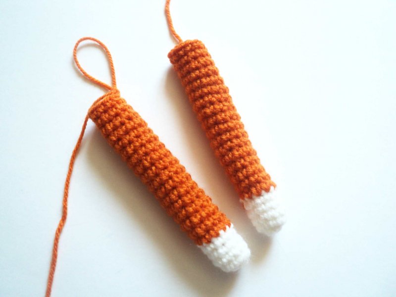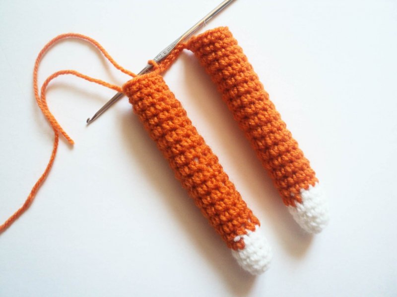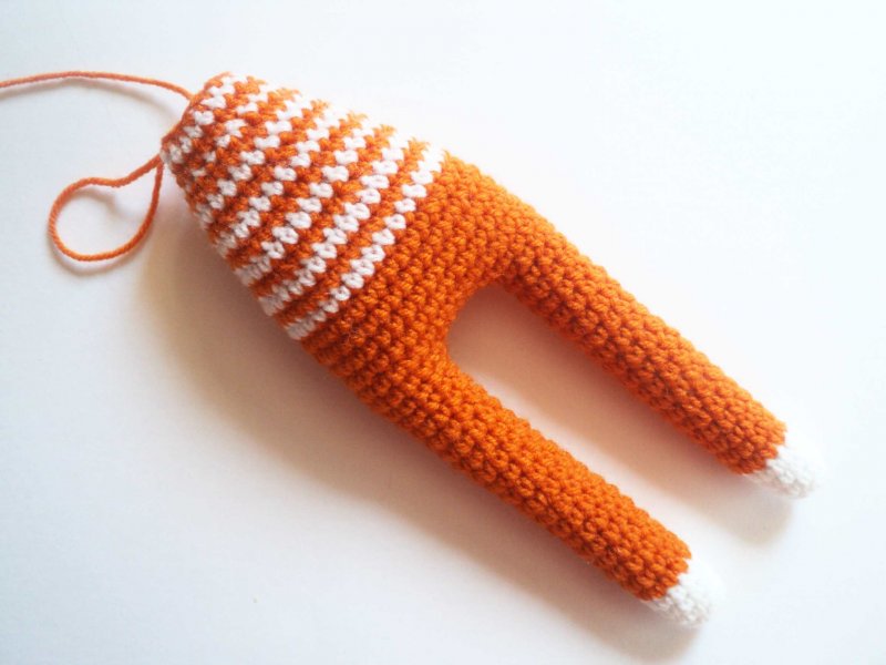 Осталось связать передние лапки. Набираем белой пряжей 2 петли и вяжем ряд с 10-ю ст.б.н в дальнюю петелечку. Вяжем 3 ряда по кругу. И затем 17 рядов рыжей пряжей. Пришиваем лапки.