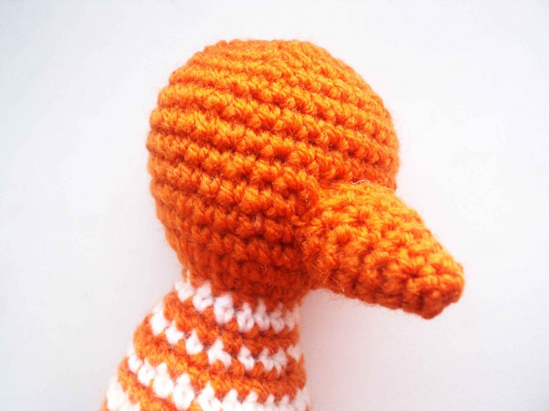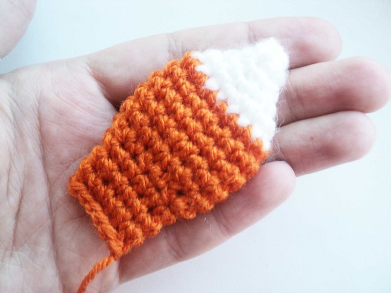 Вяжем 1 рыжий и 1 белый ряд. В следующем рыжем ряду снова делаем убавления. Теперь уже в каждую 2- петельку. И останется всего 12 ст.б.н.