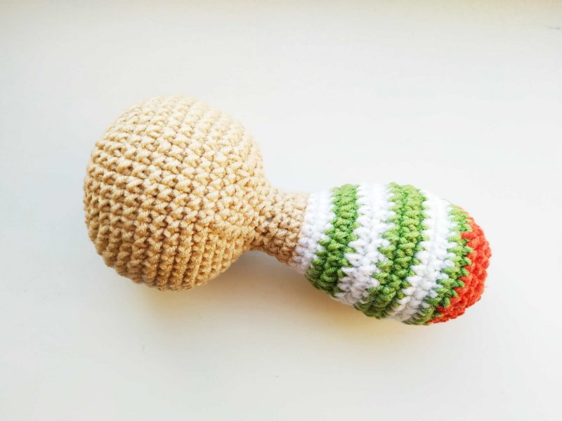 Ручки вязать будем почти так же, только по-другому будем менять нить. Начнем с бежево нити и сделаем 2 петли, внутрь первой свяжем 6 стбн.