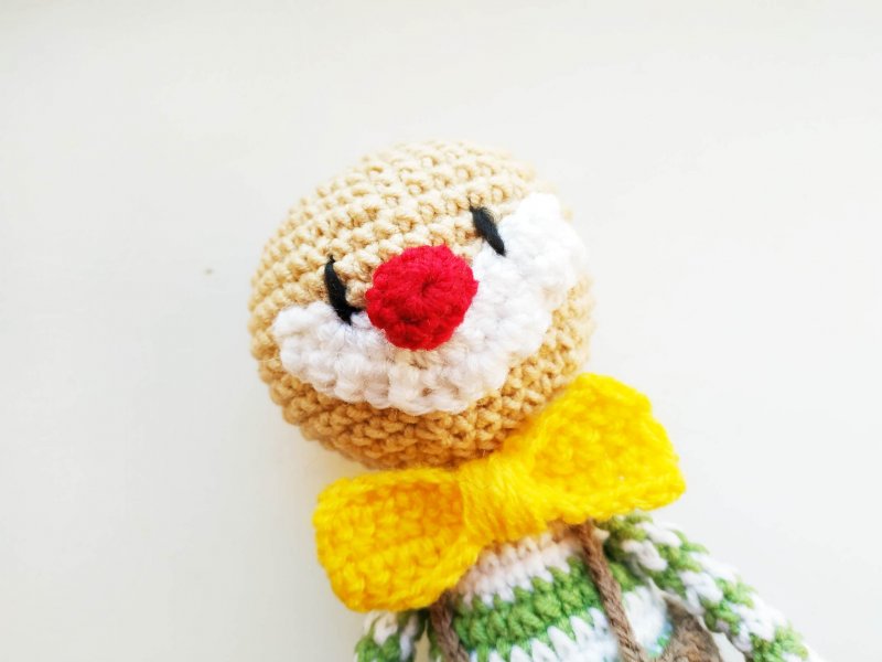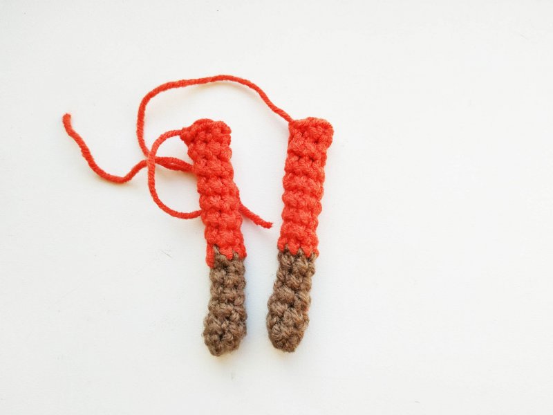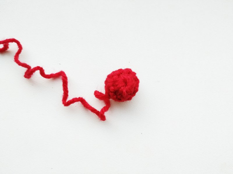 Для носика потребуется красная нить. Делаем 2 петли и в первую вяжем 8 стбн. В новом ряду будем вязать по 1 стбн в каждую петлю. Нить отрезаем, но оставляем хвостик, чтобы было удобно пришить.