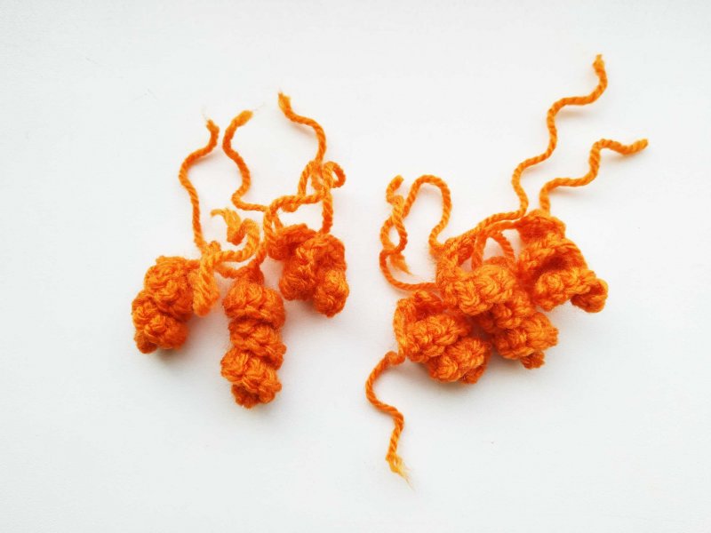 Теперь возьмем оранжевую пряжу, чтобы связать кудряшки. Сделаем 2 прядки маленькие и 1 побольше.