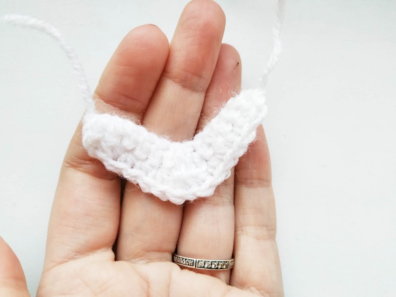 Свяжем рот, поэтому берем белую нить. Набираем 13 петель. Затем 1 воздушная петля и провязываем в обратную сторону 6 стбн. В 7 петлю вяжем 3 пстсн. Далее до конца провязываем снова стбн по 1 в петлю.