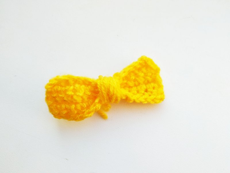 Из желтой пряжи будем делать бантик на шею. Набираем 16 петель. Затем делаем петлю подъема и провязываем 5 разворотных рядов, выполняя по 15 стбн. Затем по центру перематываем ниткой, формируя бант.