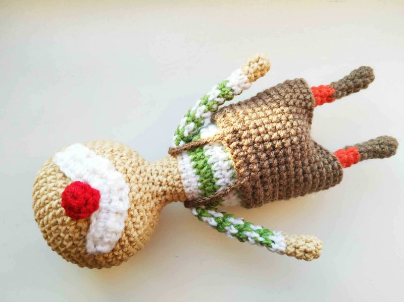 Тело и голова готовы. Теперь будем вязать ножки. Начнем с коричневой нити. Это будут ботиночки. Делаем 2 петли и провязываем в первую петлю 6 стбн.