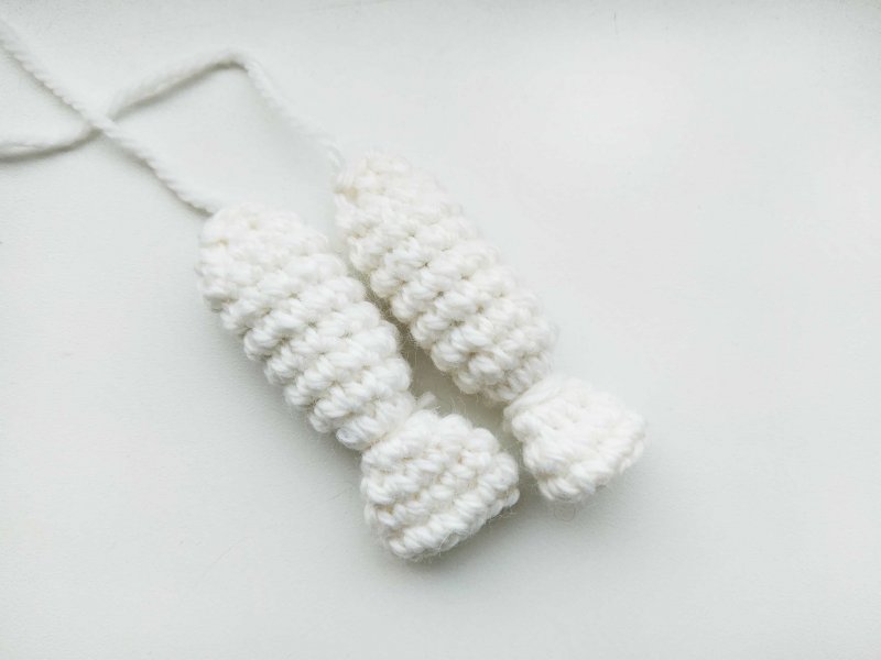 Теперь опять берем белую нить. Вязание рук начинаем с цепочки из 13 петель, которые замыкаем в кольцо. Вяжем далее по кругу 11 рядов. А потом убавляем в каждую петлю. Сшиваем отверстие стбн.