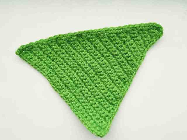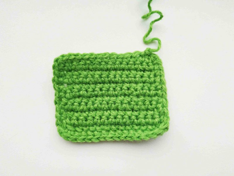 Из зеленой нити свяжем фартук. Набираем 15 петель и вяжем разворотными рядами 12 рядов. Нить не отрезаем, а делаем обвязку по краям детали.
