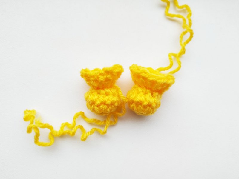 А теперь будем вязать мешочки желтой нитью. Начинаем снова с 6стбн в кольцо. Увеличиваем до 12. Провязываем 1 ряд, а затем вяжем по 2 петли. В новом ряду поднимаемся на 3 петли и вяжем по 2стсн.