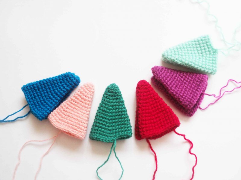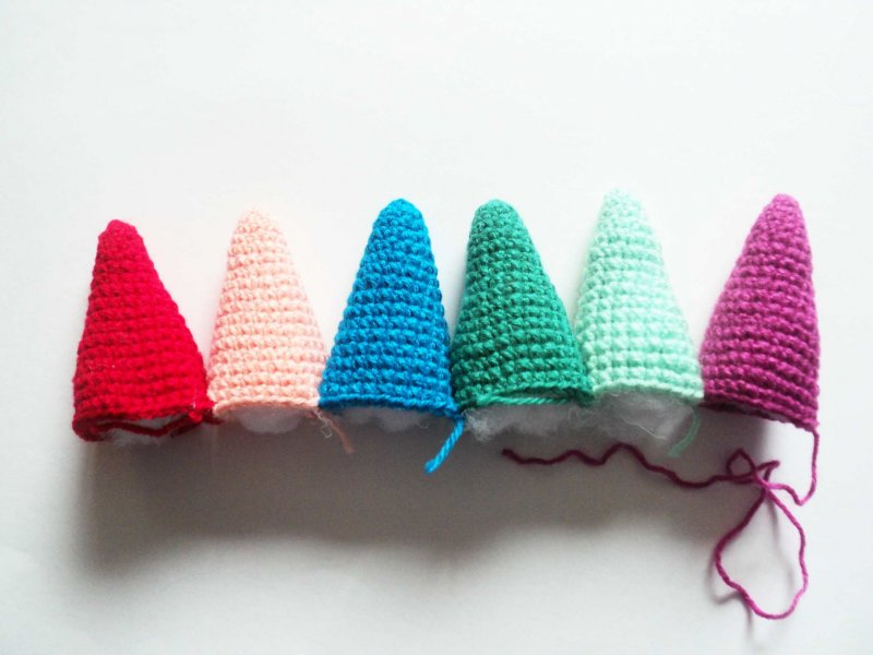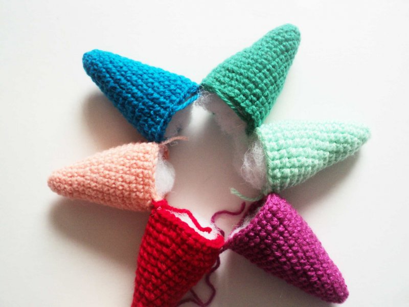 Все части игрушки будем вязать по одной схеме. Всего их будет 12 штук. Свяжем по 2 конуса каждого цвета.