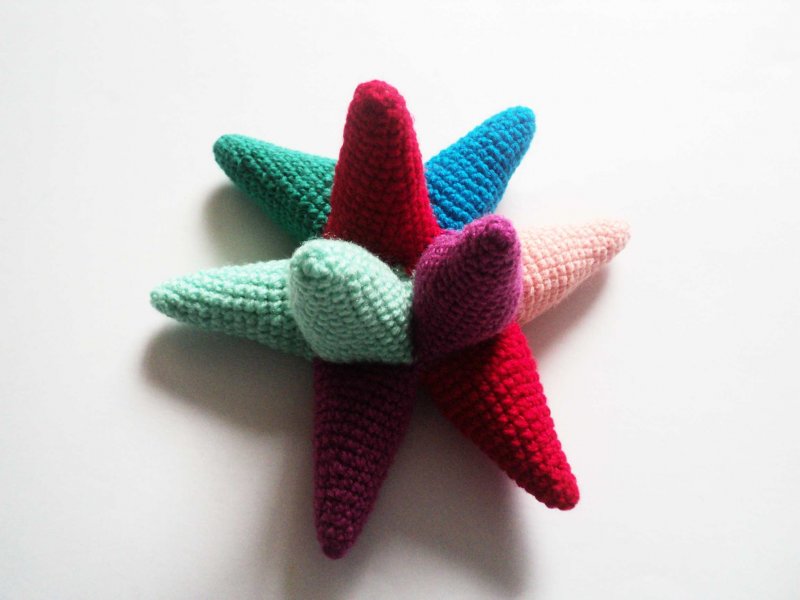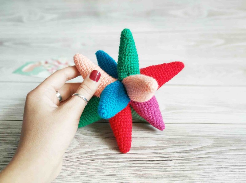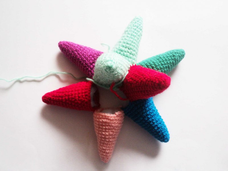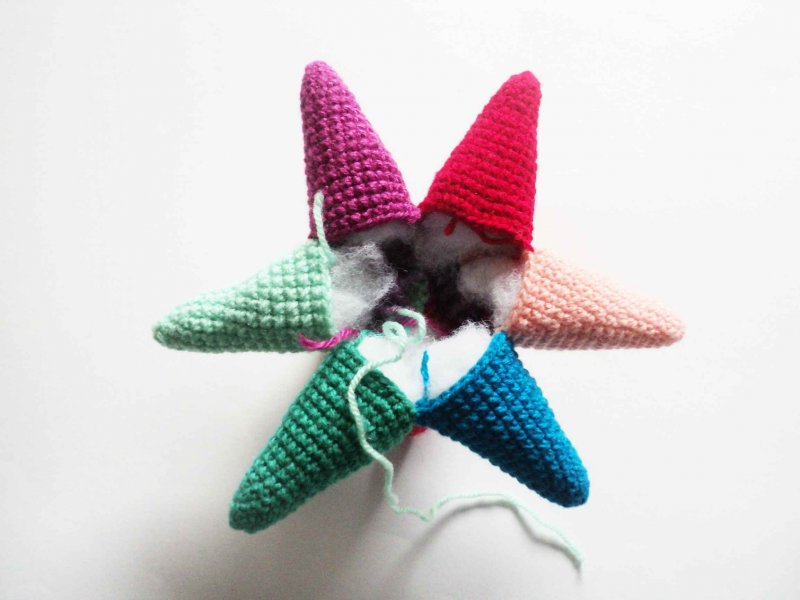 Наполняем каждый элемент синтепоном. Теперь осталось игрушку собрать. Берем 6 конусов и сшиваем их между собой последовательно.