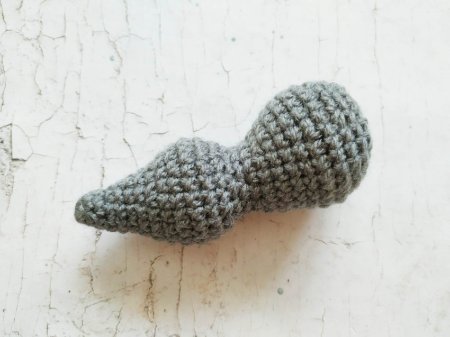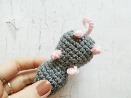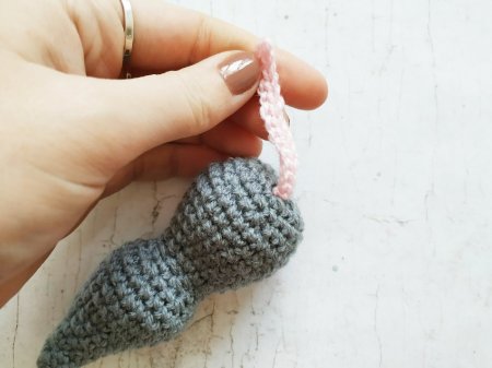 Прикрепим розовую нить сзади, чтобы связать хвост. Затем вяжем воздушные петли. Количество зависит от желаемой длины хвоста. Затем в каждую петлю провязываем по 1 сс.