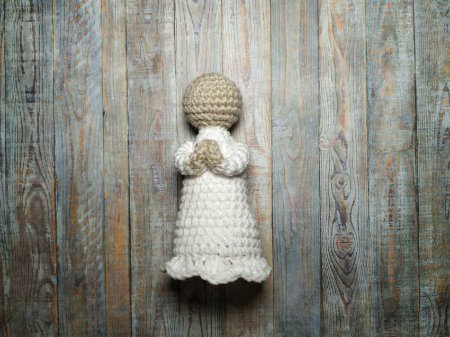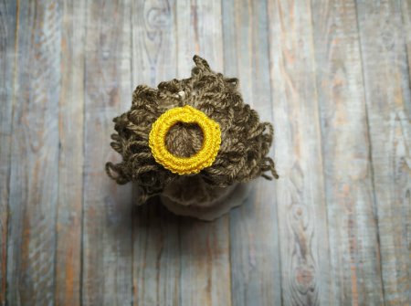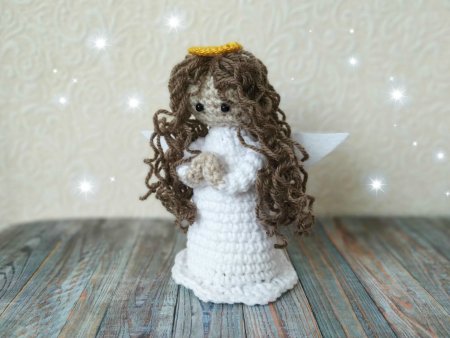 Из пряжи делаем ангелочку волосы и пришиваем их к голове. Нимб можно как пришить, так и приклеить в 2-3 местах.