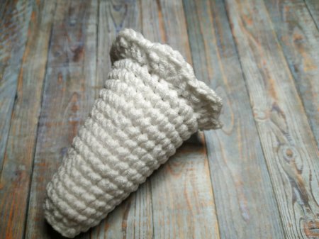 Вяжем 2 ряда по круг. Затем меняем нить на белую и вяжем еще 7 рядов.