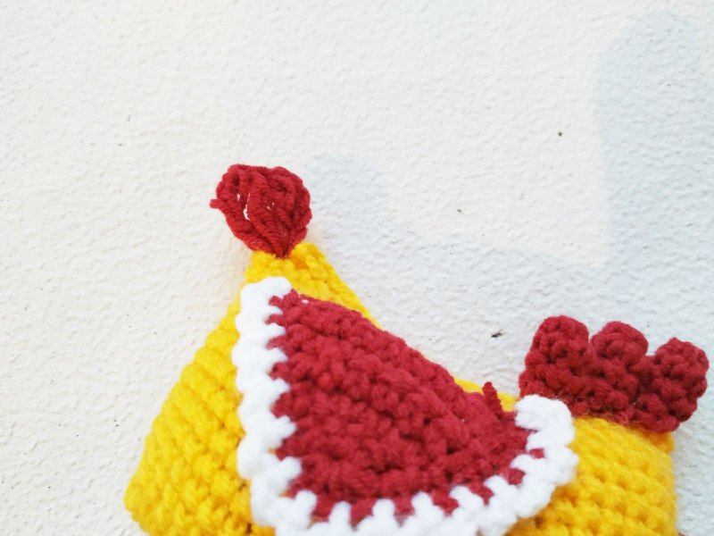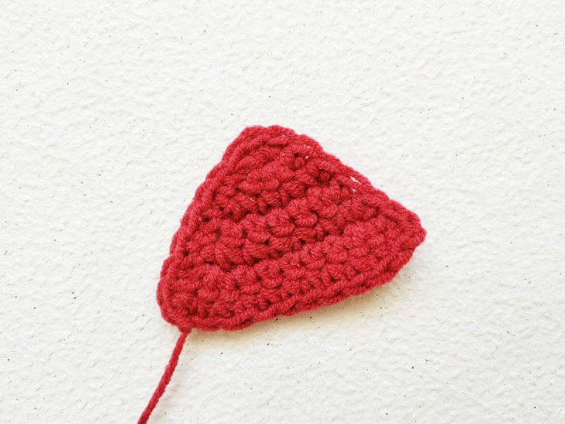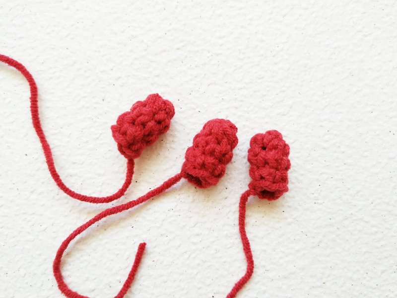Свяжем гребешок из красной нити. Формируем скользящую петлю и провязываем 6 сбн внутрь. Затем выполним по кругу 3 ряда. Таких деталей потребуется 3 штуки.