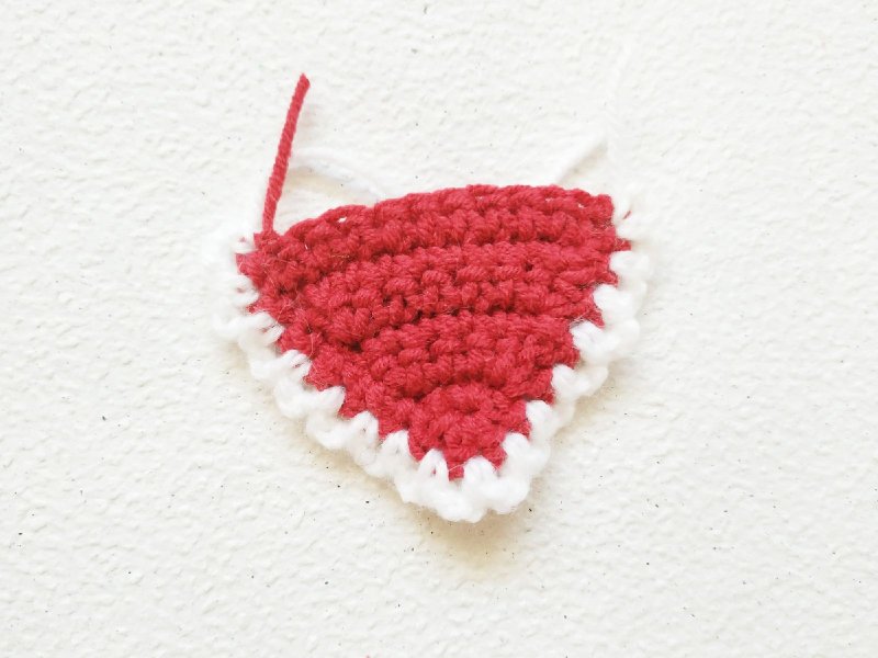 Прикрепляем белую нить и вяжем 3 петли. Затем выполняем 1 соединительный столбик в следующую петельку. И так вяжем по 2 сторонам.