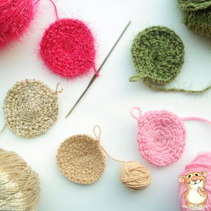 1. Чтобы связать одну из половинок будущей елочной игрушки надо сделать столбик из 5 воздушных петель и замкнуть его в кольцо, протянув рабочую нить сквозь первую и последнюю петли. Далее вязать по кругу "рачьим шагом" - каждый раз протягивая через петлю рабочую нитку и прибавляя к ней еще одну петлю, чтобы увеличить круг в диаметре.