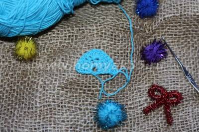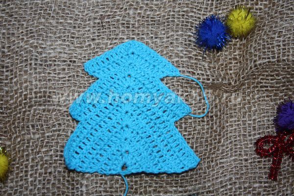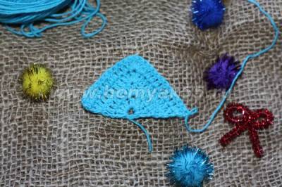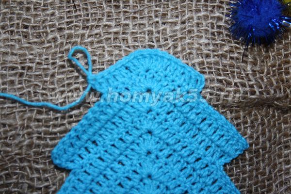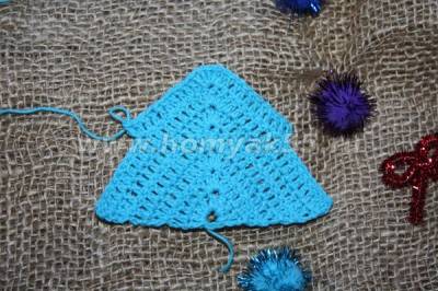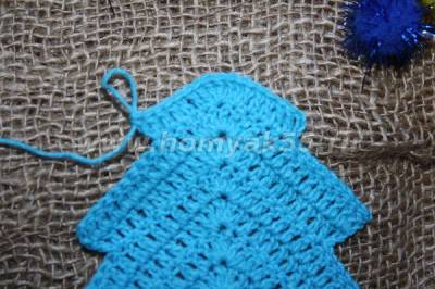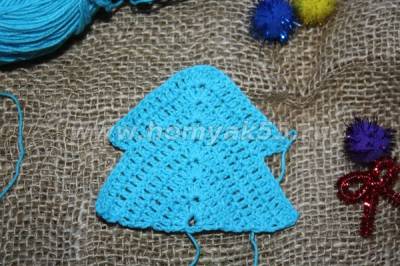 И вот, первый «ярус» нашей ёлочки готов. Теперь, для того, чтобы начать работу над вторым ярусом, необходимо подняться немного вверх по последнему ряду потому, что вязание следующего ряда начинается как-бы с середины предыдущего.