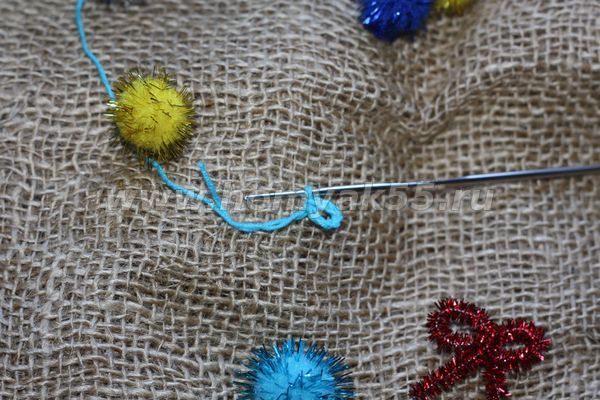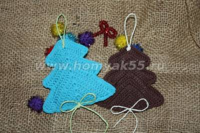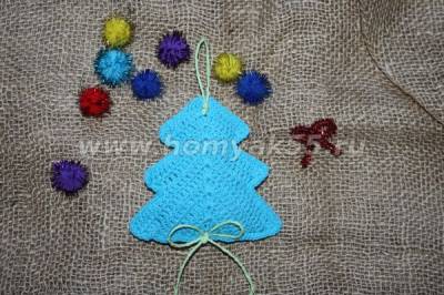 Делаем бантик, пришиваем ниточками к изделию, также пришиваем петельку, с помощью которой изделие будет привешено на ёлку. Вот и всё, мы справились, наша елочка готова, можно навязать их несметное кол-во, подарить как памятный сувенир дорогим для сердца людям, украсить дом к Рождеству и Новому Году.