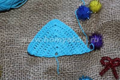 4 ряд. 3 п.п, 10 столбиков с накидом, 5 столбиков с накидом в одну петлю нижнего ряда, 9 столбиков с накидом, 2 столбика с накидом в одну петлю нижнего ряда.