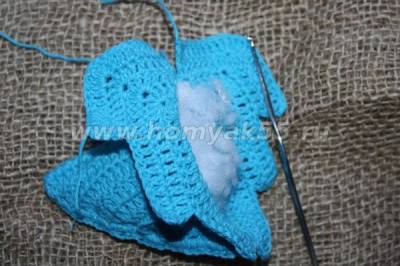 2 детали складываем друг к дружке, и обвязываем крючком их столбиками, соединяя их тем самым между собой, не забываем вложить синтепон в середину.
