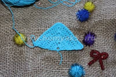6 ряд. 3 п.п, 16 столбиков с накидом, 5 столбиков с накидом в одну петлю нижнего ряда, 15 столбиков с накидом, 2 столбика с накидом в одну петлю нижнего ряда.