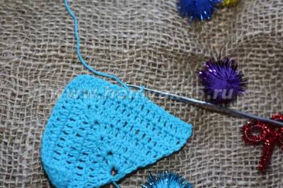 7 ряд. 11 полустолбиков по краю нижнего (6 ряда), 3 п.п, 9 столбиков с накидом, 5 столбиков с накидом в одну петлю нижнего ряда, 8 столбиков с накидом, 2 столбика с накидом в одну петлю нижнего ряда.