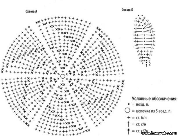 Вяжите яблоко в две нити диаметром 10 см по схеме А. По схеме Б свяжите два листика.$CUT$ Используя коричневую пряжу для черенка, наберите 10 ВП, на них провяжите 10 полустолбиков (ПС). Соберите на черенок листья и пришейте к основе. Низ яблока стяните нитью коричневого цвета. На лист приклейте божью коровку.