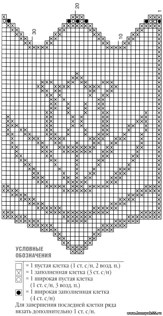 Филейный узор: для пустой клетки вязать 1 ССН и 2 ВП, для заполненной клетки 3 ССН. Каждый ряд начинать с 3 ВП подъёма вместо 1-го ССН и заканчивать 1 ССН в ВП подъёма предыдущего ряда.