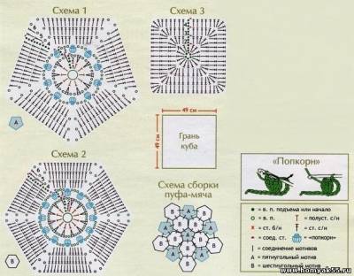 Соединить мотивы по схеме сборки 1 рядом СБН, при этом шестиугольные мотивы соединять друг с другом нитью белого цвета и затем соединять с пятиугольными мотивами нитью голубого цвета. Оставить один мотив неприсоединенным, чтобы иметь возможность наполнить изделие. Из ткани выкроить 2 крута диаметром 60 см и полосу шириной 20 см и длиной 190 см, вшить полосу между кругами. Вставить деталь из ткани внутрь вязаной детали, наполнить шариками из пенопласта, выполнить последний шов на детали из ткани и затем присоединить последний мотив.Пуф-куб