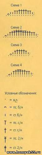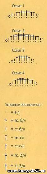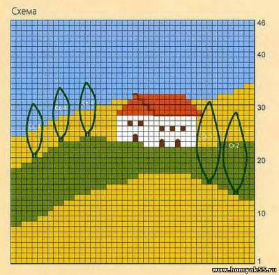 Набрать 46 ВП + 1 краевую ВП из желтой (или зеленой) пряжи. 1-й ряд: пропустить краевую ВП и связать 46 СБН. Продолжить по счетной схеме СБН. 8-й ряд начать зеленой мелированной. В 13-м ряду на лиц. стороне начать отдельным мотком зеленой мелированной нити, после 18-го ряда отрезать.$CUT$ Начиная с 23-го ряда, желтой пряжей с 2 мотков вяжется слева и справа от домика.При перемене цвета последняя петля прежнего цвета провязывается уже новым. Нитку ненужного цвета вести за собой и убирать внутрь вязания (схема 3). В заключение выполнить 10 ВП и 1 ПС замкнуть их в петельку для подвешивания. Окошки и скат крыши вышить коричневым, угол дома - оранжевым. Деревья вяжутся по отдельности и пришиваются. Деревья по схемам 1, 2, 3 связать по 1 разу, дерево по схеме 4-2 раза.
