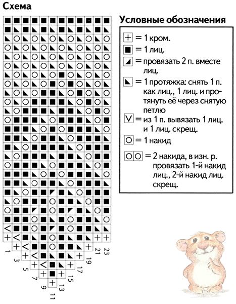 Ажурный узор: вяжите по схеме, на которой приведены только лиц. ряды, в изн. рядах петли вяжите лиц. Повторяйте с 1-го по 24-й ряды, закончите работу 22-м рядом.