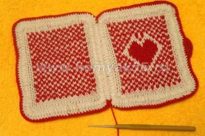 Обе половинки сшила между собой книжечкой и обвязала по контуру контрастным цветом.