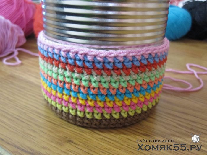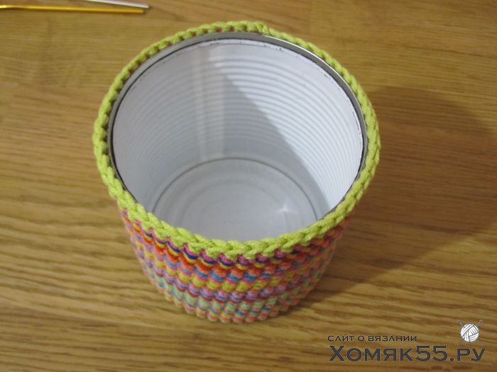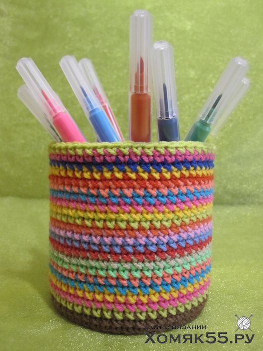 Для вязания можно взять уже готовую, купленную в магазине подставку для карандашей или фломастеров и украсить ее, а можно воспользоваться самой обычной жестяной баночкой от консервированного горошка или кукурузы (что есть в наличии), загнуть режущий край, чтоб не пораниться. И в первом и во втором случае изделие будет выглядеть замечательно.
